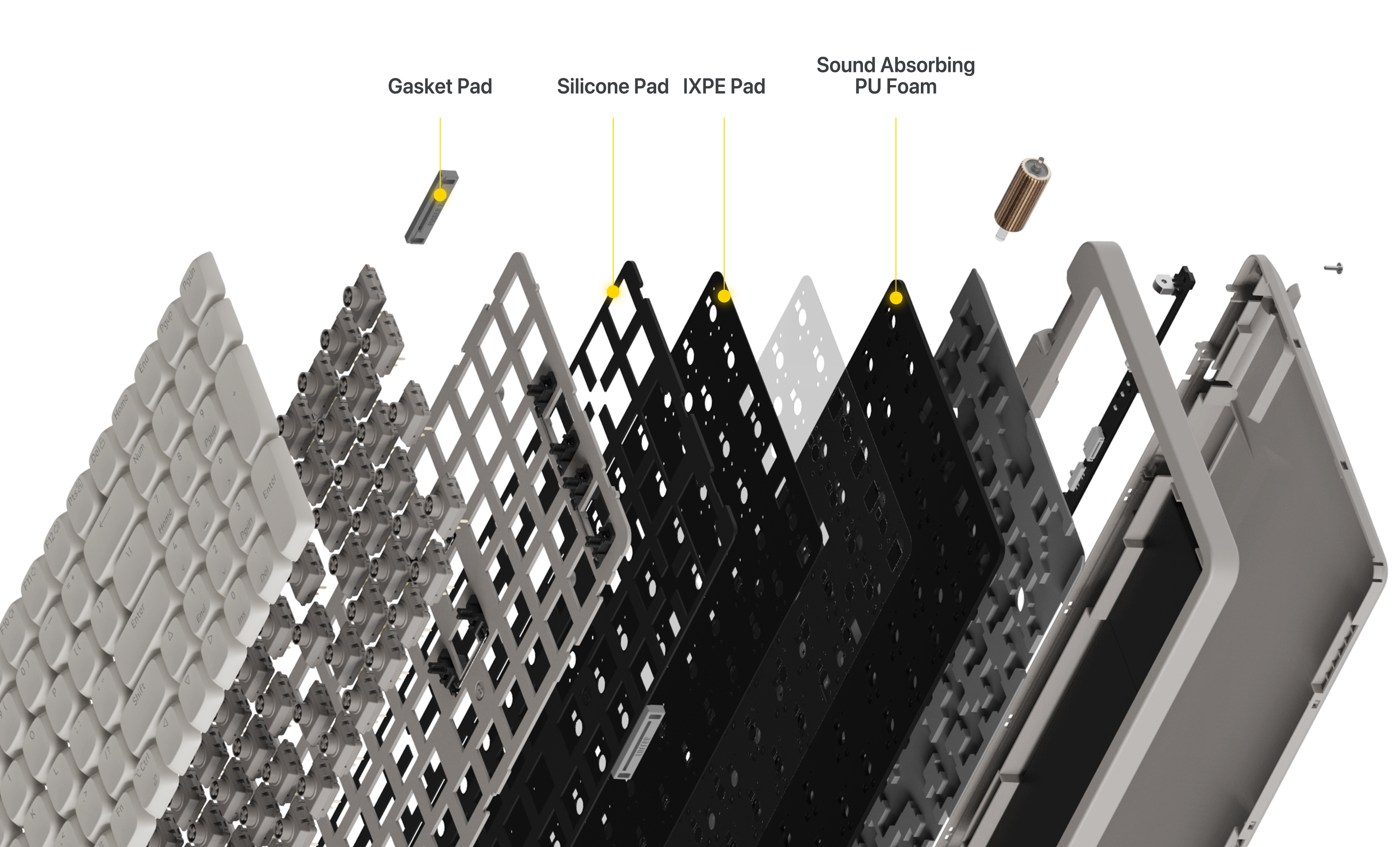 各キーストロークは2つのシリコンダンパーによってクッションされ、驚くほど静かな打鍵音を実現。まるで神々のごとく軽やかで穏やかなタイピング体験をお楽しみいただけます。 -