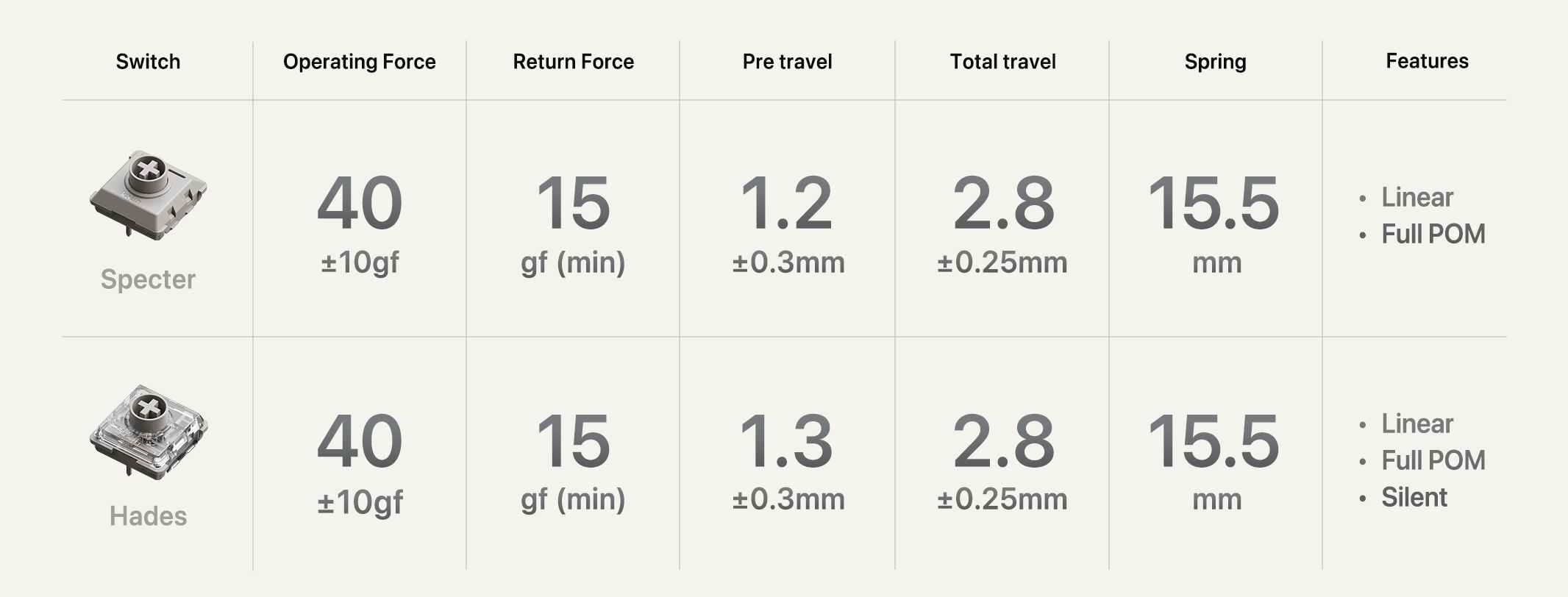 LofreeとKailhのロープロファイルフルPOMスイッチファミリーに新たに加わったSpecterとHadesをご紹介します。自然に指を曲げた状態でタッチを和らげ、手首への筋肉負担を軽減することを目指し、作動力を50gfから40gfに引き下げました。これにより、長時間のタイピング時の指関節の疲労を大幅に軽減します。