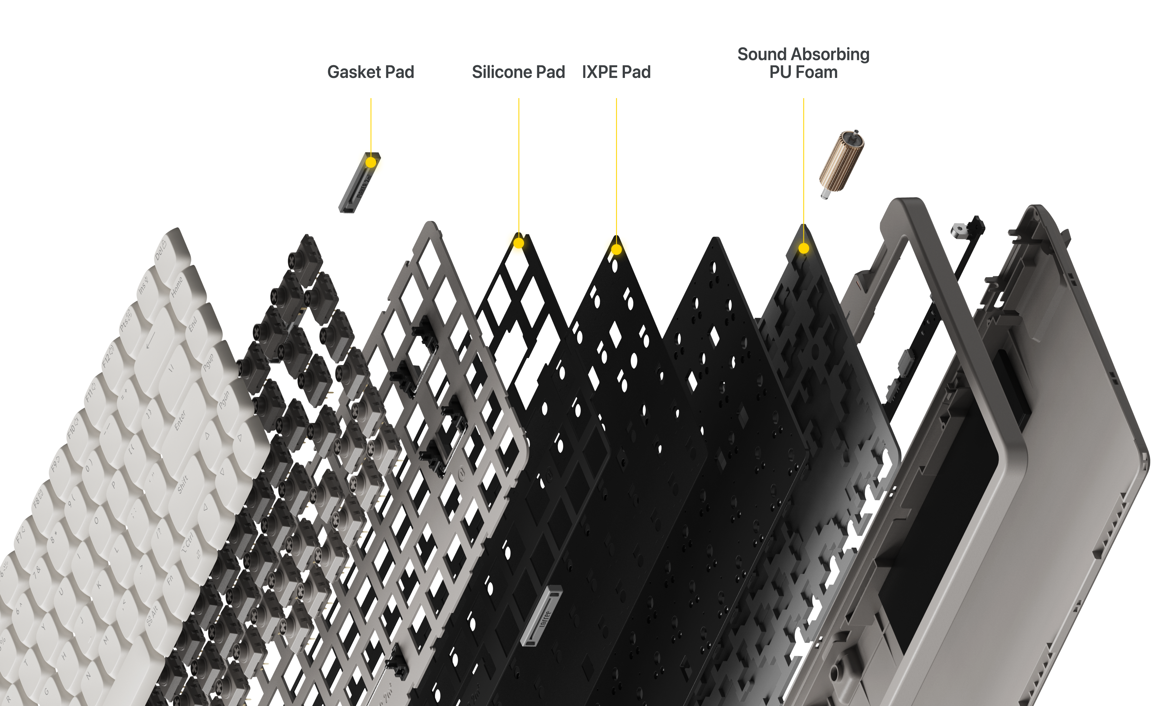 各キーストロークは2つのシリコンダンパーによってクッションされ、驚くほど静かな打鍵音を実現。まるで神々のごとく軽やかで穏やかなタイピング体験をお楽しみいただけます。 -
