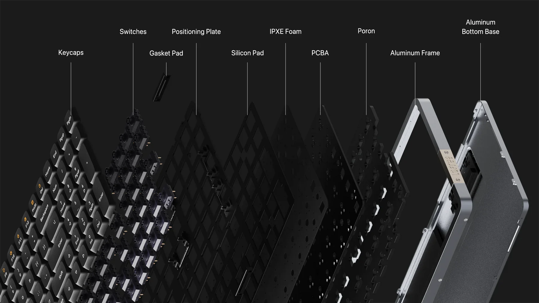 本機は高級感のあるアルミニウム筐体を採用しています。新開発のロープロファイル「Kailh社製 POMスイッチ」(ファクトリールブ済。リニア:Ghost、タクタイル:Phantom)とロープロファイルメカニカルキーボードとしては世界初の「ガスケットマウント」を搭載していることによって、スムーズで快適な打鍵感・打鍵音を提供いたします。