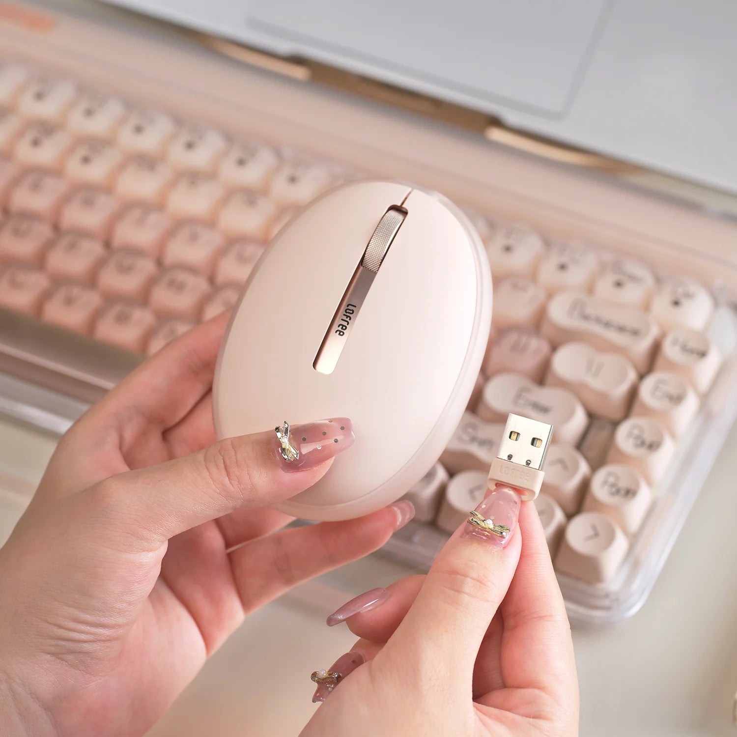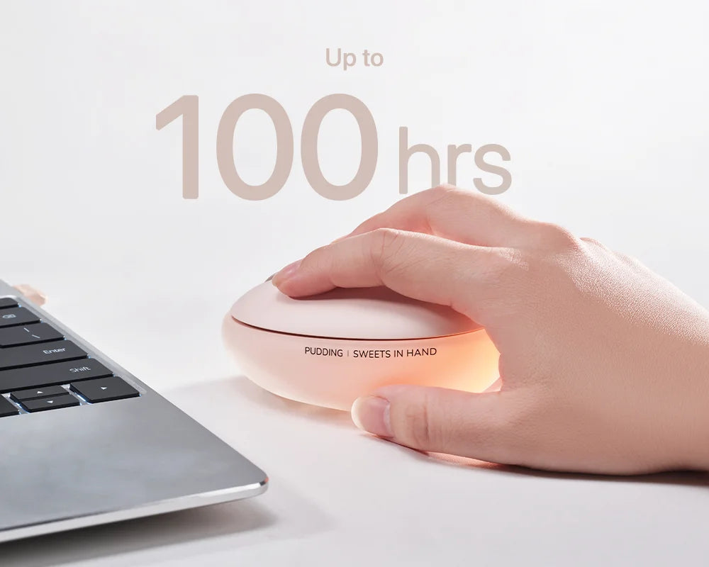Pudding ワイヤレスマウスはプレミアムな二色成形(ダブルインジェクション)技術を採用し、異なる2つの質感を美しく融合させています。洗練された半透明ボディは内部のLEDライトをやわらかく受け止め、拡散するように設計され、デスクの上にほのかで幻想的な雰囲気を演出します。