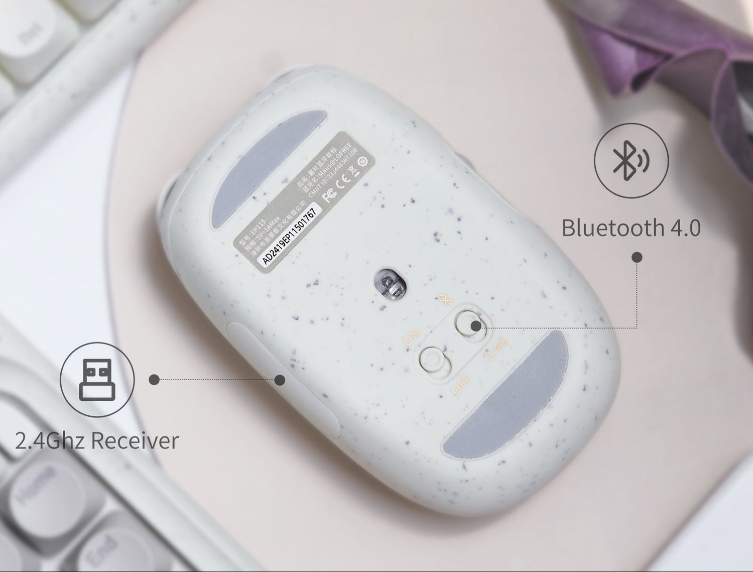 Bluetooth 4.0 と 2.4GHz のデュアルモード接続に対応。マウス底面の切替ボタンで、Bluetoothモードと2.4Gモードの2台のデバイス間を簡単に切り替え可能です。シンプルかつ便利に、複数のデバイスで作業できます。